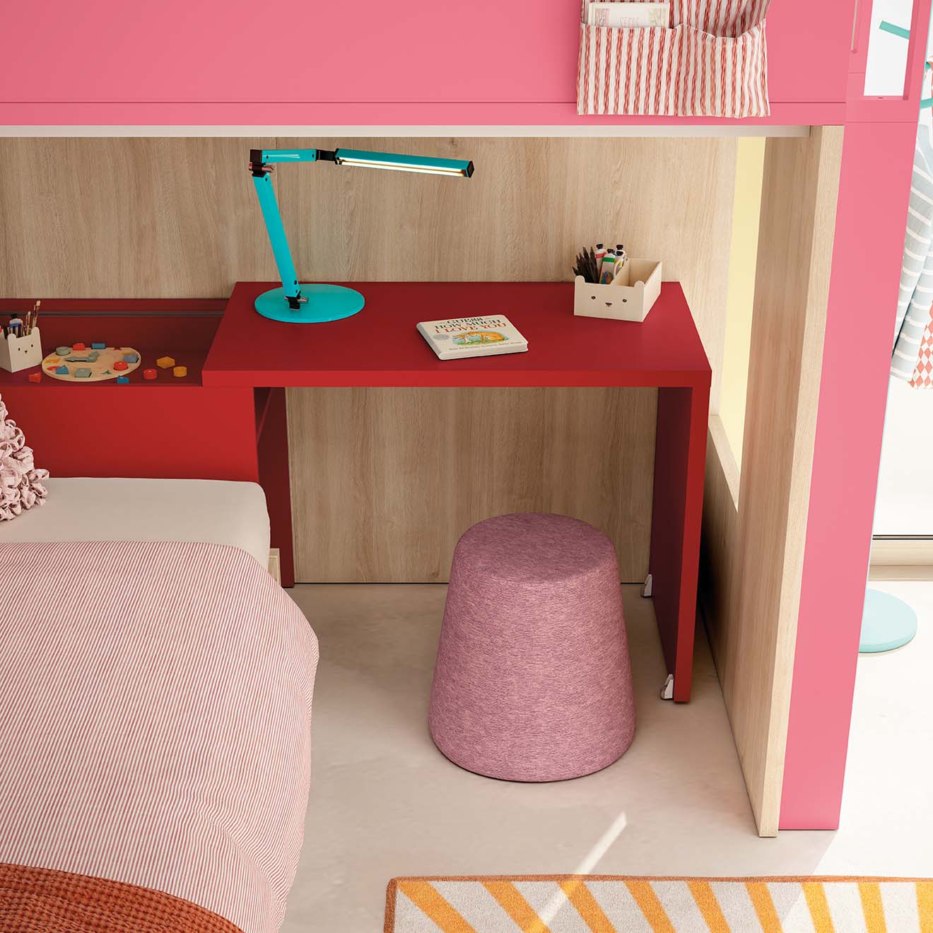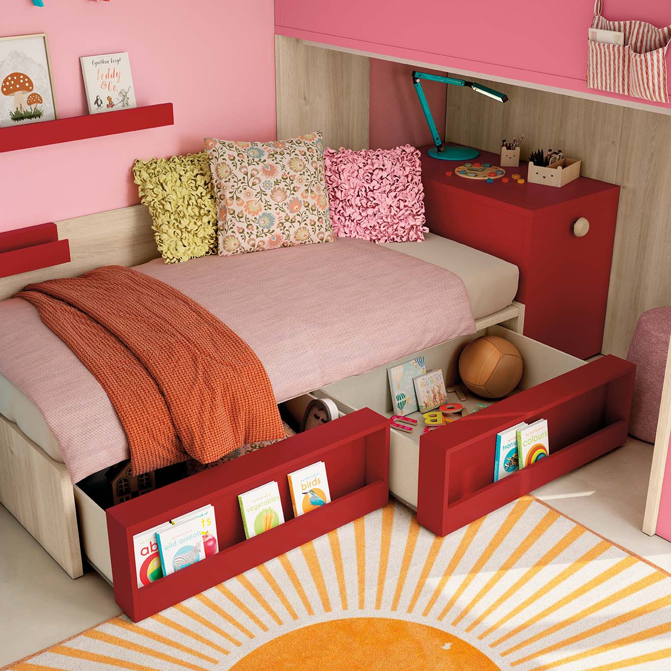 La litera cuenta con una escalera a su derecha y un estante revistero en la parte superior, el rincón perfecto para que tengan a mano sus cuentos favoritos u otros objetos antes de dormir. En la parte inferior, encontramos una cama con dos cajones y estantes revisteros que le dan un toque personal y atrevido al dormitorio. Además, hemos incluido un fondo con arcón y escritorio extraíble, la solución ideal para aprovechar al máximo el espacio y que tengan su propio lugar de estudio y juegos.